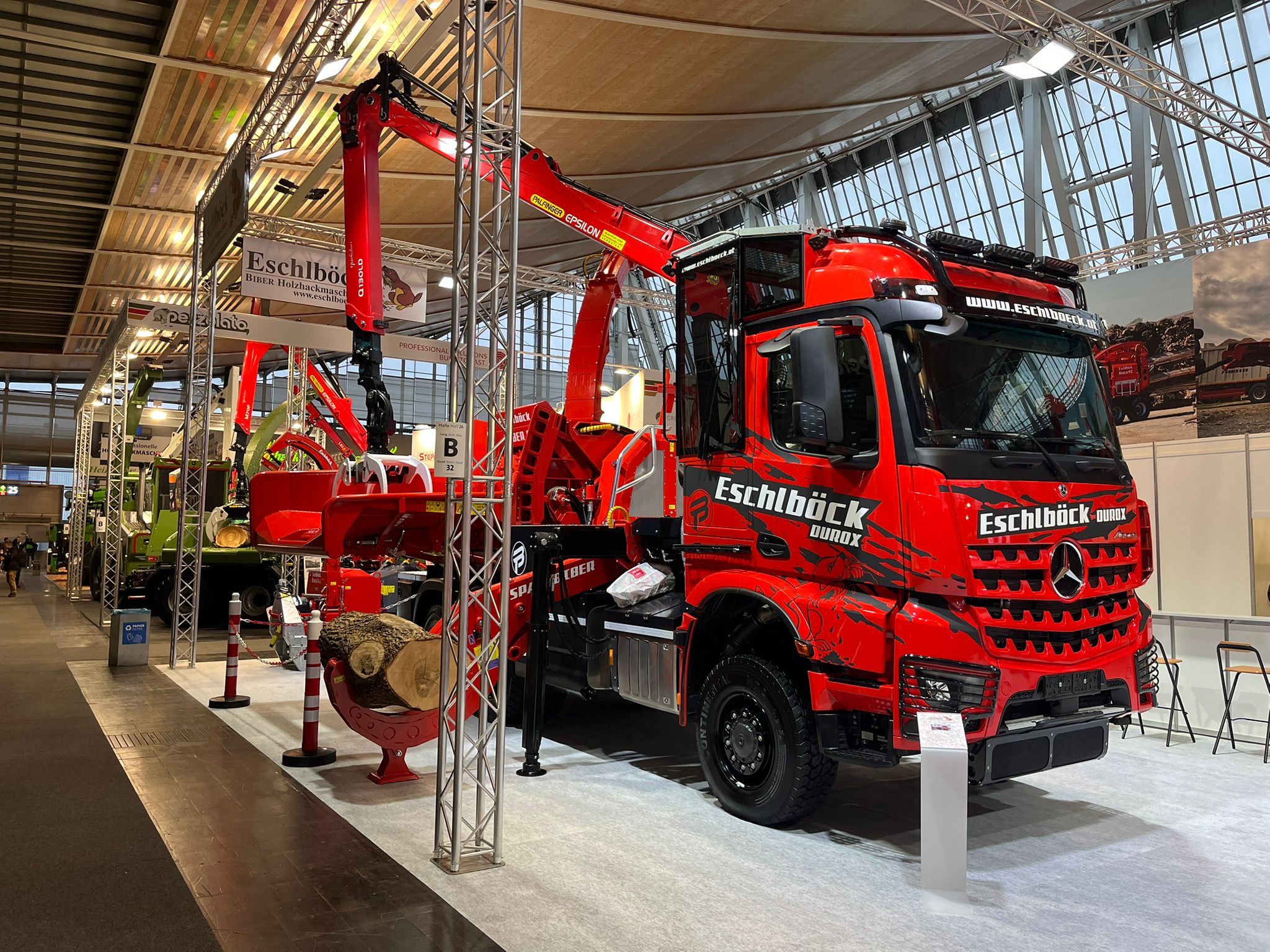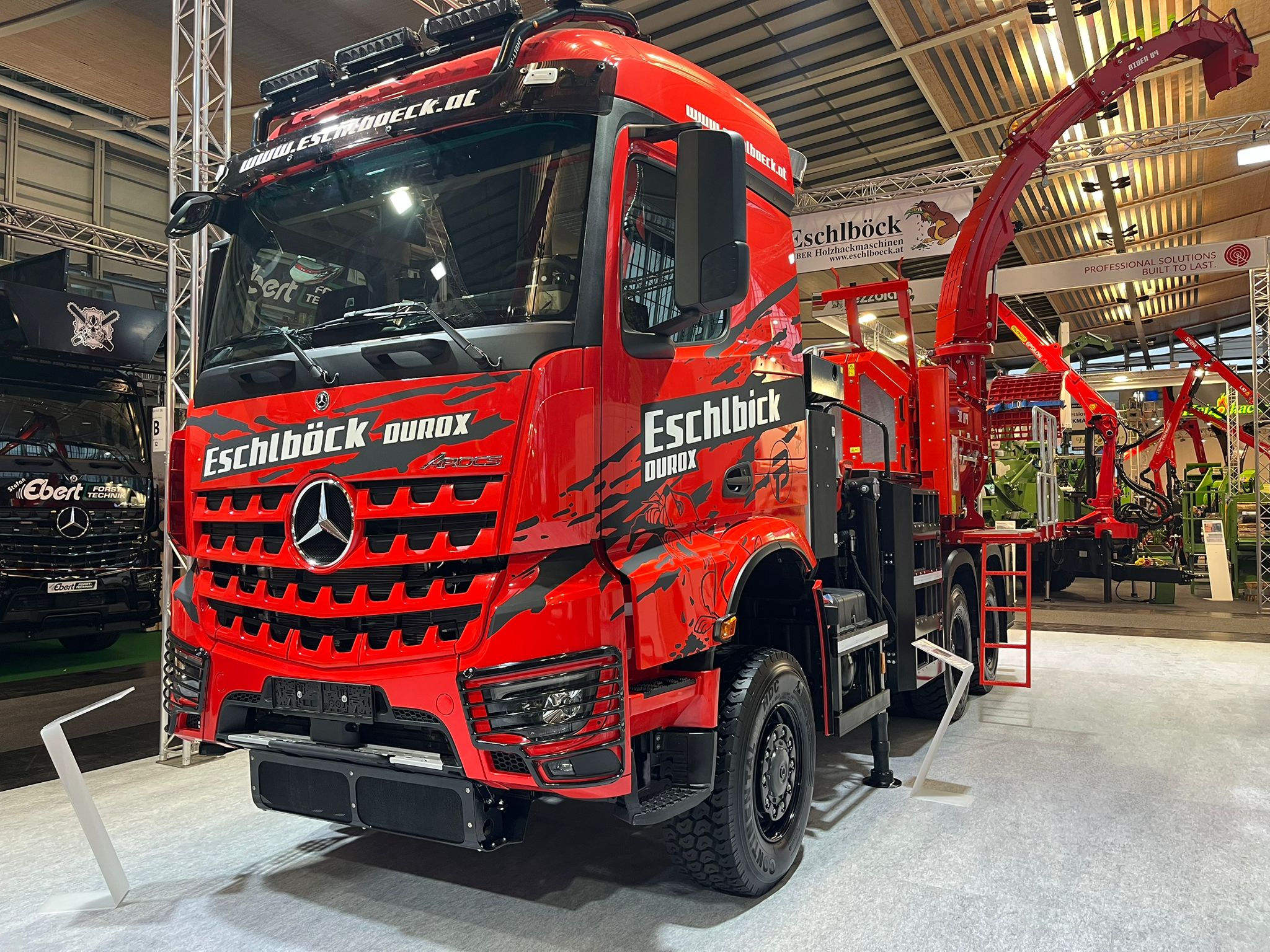 Auf der Agritechnica präsentieren wir erstmals einen neuen Biber-Truck mit Mercedes- Stern. Neben MAN und VOLVO ist nun auch Daimler Truck im Eschlböck Portfolio. Der neue DUROX ist ein Biber 84 mit dem ausgewählten Chassis eines Mercedes Arocs 6x6 und mit Euro 6 E Motor, 530 PS und 2600Nm. Eschlböck entwickelte damit eine weitere neue geländegängige Fahrzeuglinie, die optimal für den Hackbetrieb ausgestattet ist.